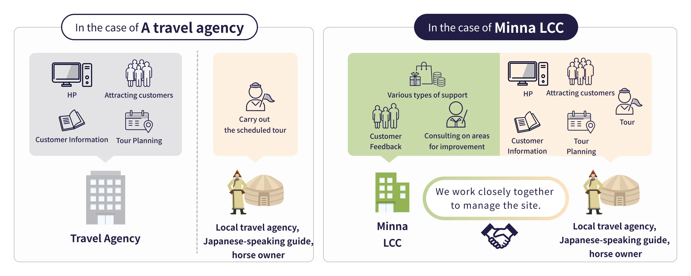 We create tours that bring out the best of the local area and the people, and that cannot be imitated by competitors. We visit the local area and provide education and fill in any gaps. -